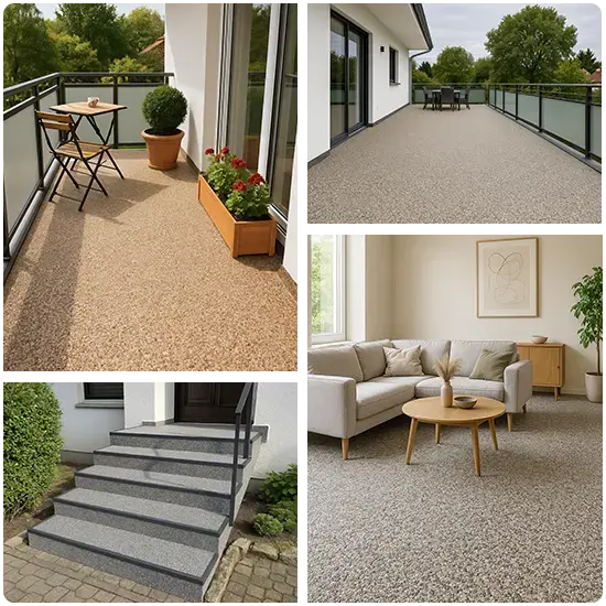 - Steinteppichböden bietet nahtlose Haltbarkeit, Rutschfestigkeit und einfache Pflege, perfekt sowohl für den Innen- als auch für den Außenbereich